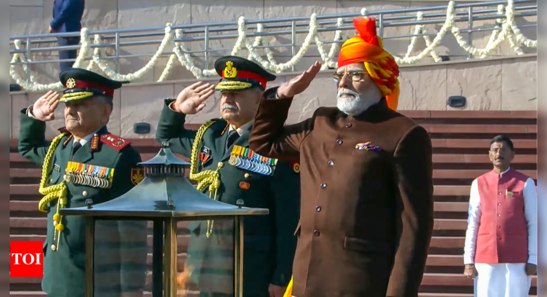 NEW DELHI: Prime Minister Narendra Modi opted for a red and yellow striped “safa” complemented by a brown bandhgala jacket with a pocket square for the 76th Republic Day celebrations on Sunday.