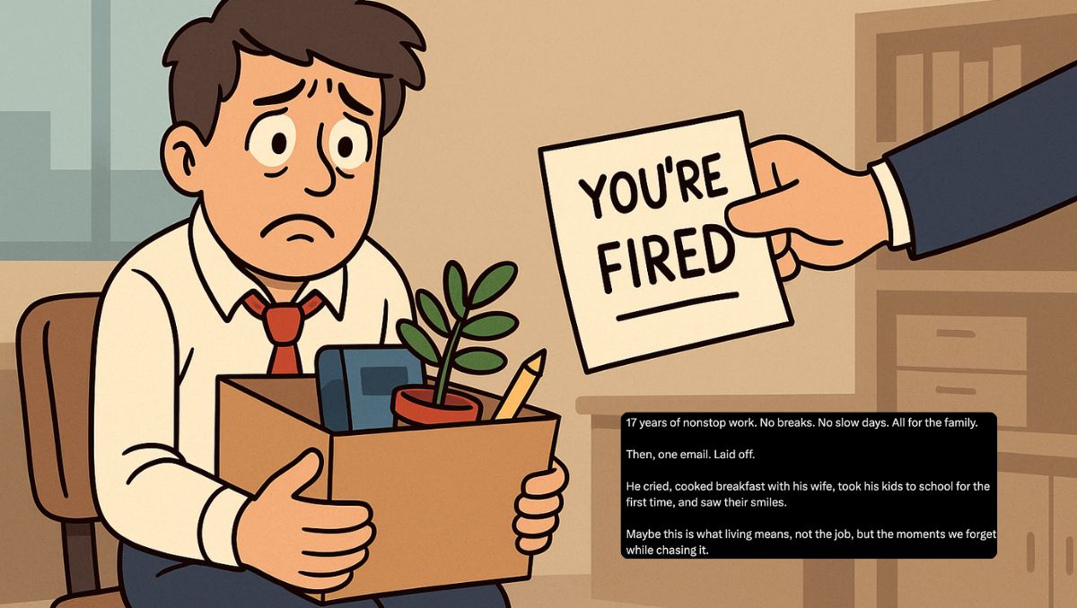 He later informed his wife over coffee, and instead of panic, she reassured him they would face it together as a family. Her calm support made him “break into tears again”. His post quickly went viral, tapping into widespread frustration with “hustle culture” and the burnout tied to long-term corporate loyalty, especially in tech where layoffs have become increasingly common.