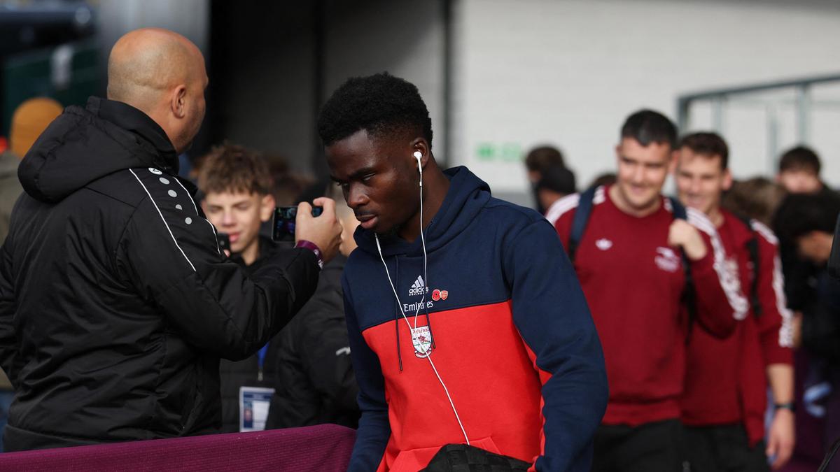Arsenal's Bukayo Saka arrives at the stadium ahead of the match. | Photo Credit: REUTERS