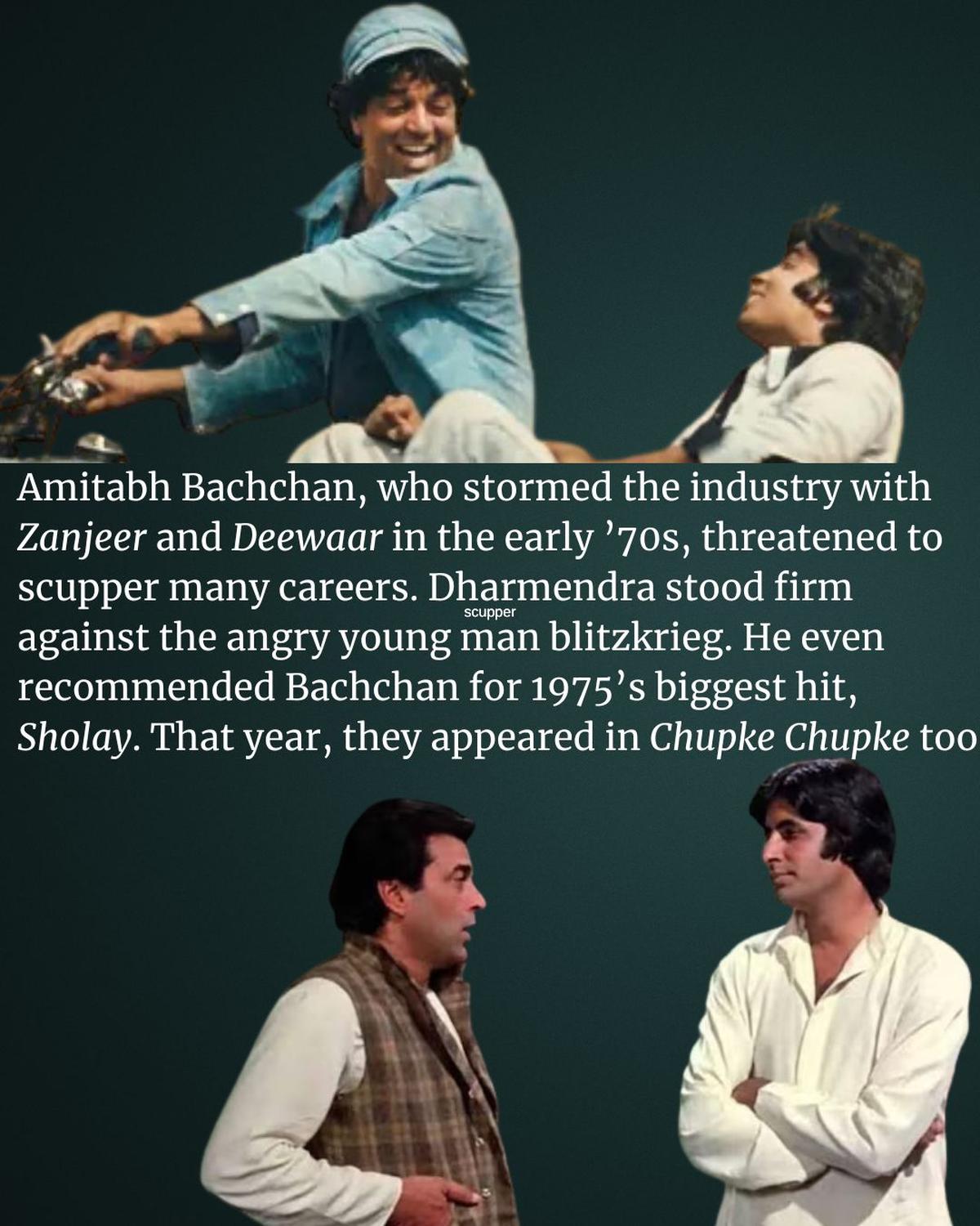 Bachchan, who stormed the industry with Zanjeer (1973) and Deewaar (1975), threatened to scupper many careers. Dharmendra stood firm against the angry young man blitzkrieg.
