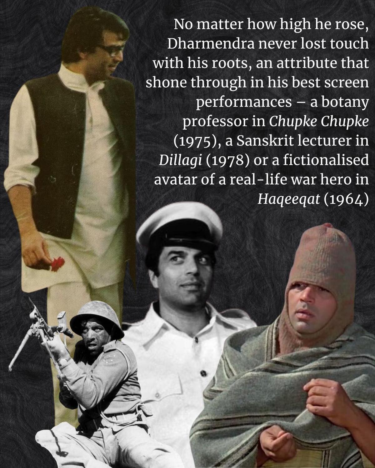 No matter how high he rose, Dharmendra never lost touch with his roots, an attribute that shone through in his best screen performances, no matter who he was playing — a botany professor in Chupke Chupke, a Sanskrit lecturer in Dillagi or a fictionalised avatar of a real-life war hero in Haqeeqat.