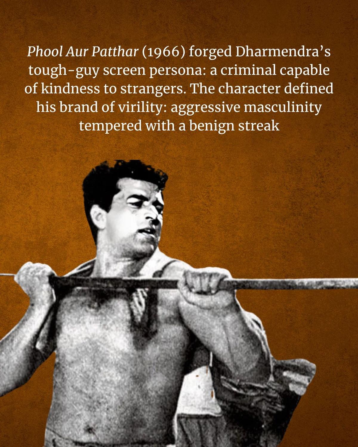 In Phool Aur Patthar, the 1966 drama that forged Dharmendra’s tough-guy screen persona, he was a criminal capable of kindness to strangers. In a brief sequence, his character takes his shirt off and uses it to cover an old lady shivering in the cold.