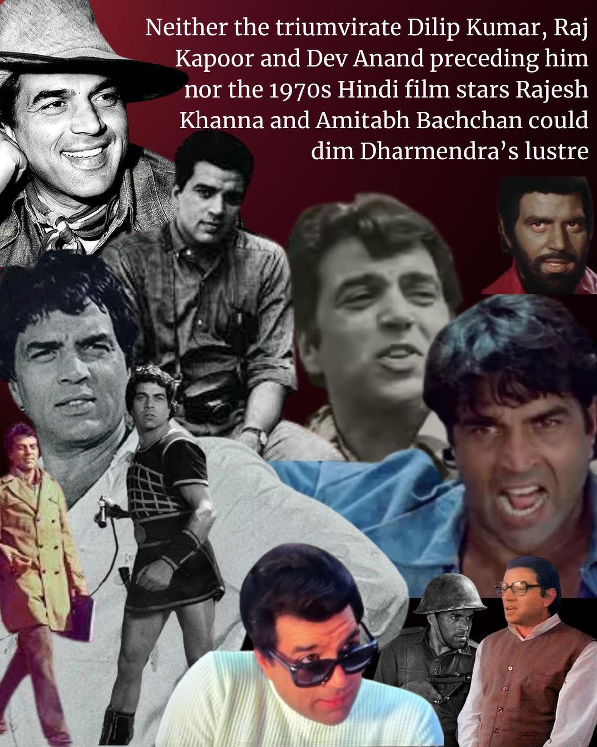 Dharmendra’s popularity was as enormous as it was durable. Neither the terrific triumvirate of Dilip Kumar, Raj Kapoor and Dev Anand who preceded him nor the all-conquering duo of Rajesh Khanna and Amitabh Bachchan who altered 1970s Hindi cinema could influence the course of his stardom or dim its lustre.
