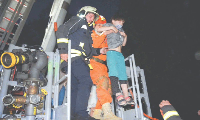 RESCUERS evacuate a resident from an apartment building in Odesa damaged during a Russian drone strike on Thursday.—Reuters