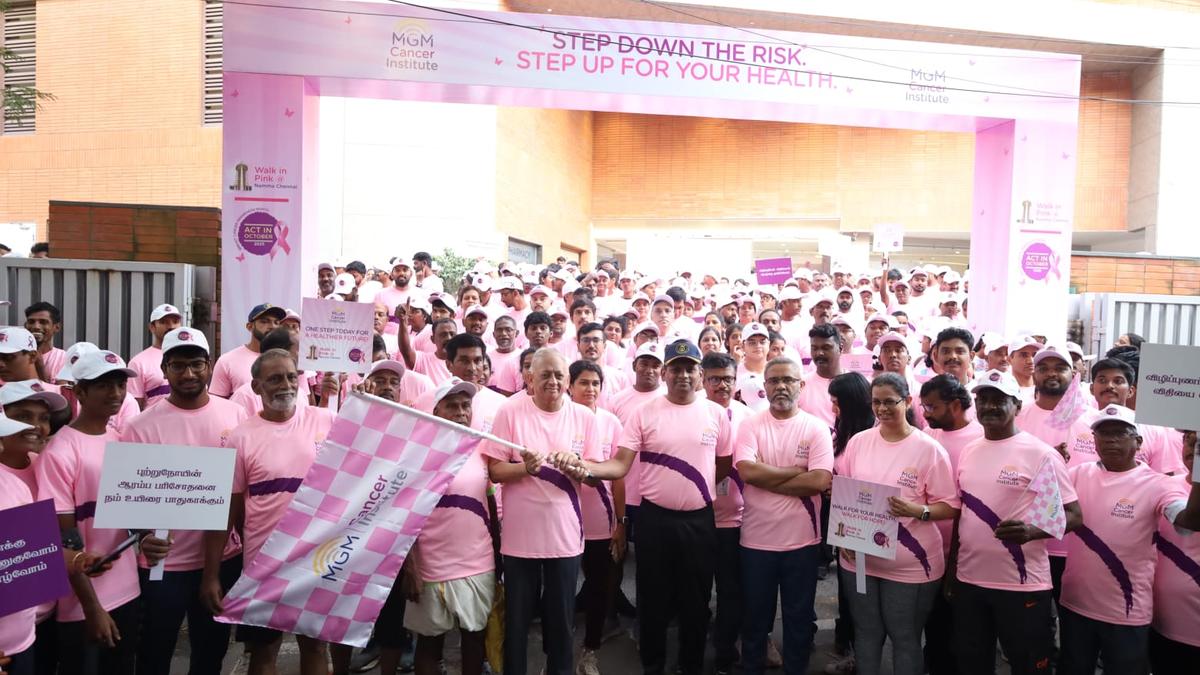 More than 1,000 participants, including healthcare professionals, students, and members of the public, joined the “Walk in Pink” walkathon organised by MGM Cancer Institute on Sunday (November 2, 2025) to raise awareness about breast cancer.