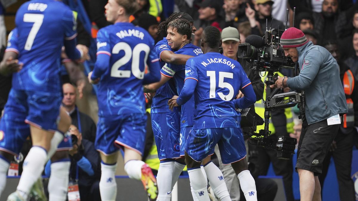 Chelsea’s Enzo Fernandez, back centre, is congratulated after scoring his side’s opening goal during the English Premier League match between Chelsea and Liverpool at Stamford Bridge stadium in London, Sunday, May 4, 2025.