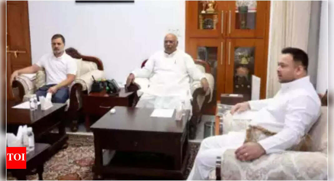 RJD neta Tejashwi Yadav, accompanied by MPs Manoj Jha and Sanjay Yadav, visited Congress president Mallikarjun Kharge for discussions that included Rahul Gandhi, AICC general secretary K C Venugopal and Gurdeep Sappal.