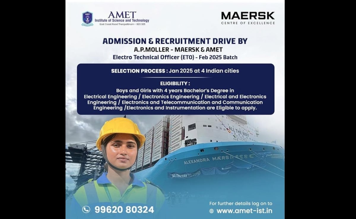 AMET University, in collaboration with A.P. Moller – Maersk, invites applications for the Electro Technical Officer (ETO) program at Maersk Centre of Excellence. This program provides exceptional training, scholarships, and a pathway to a rewarding career in the Merchant Navy.
