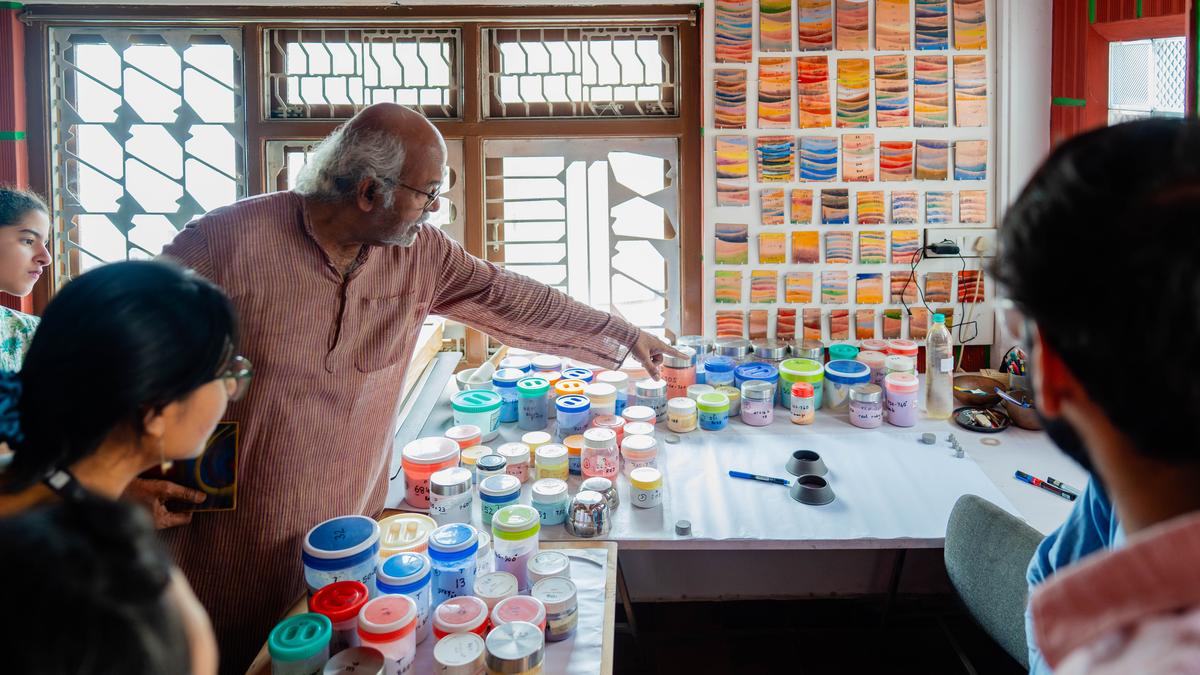 Senior artist M. Senathipathi at Cholamandal art village on Friday. | Photo Credit: Akhila Easwaran The many worlds of Manickam…