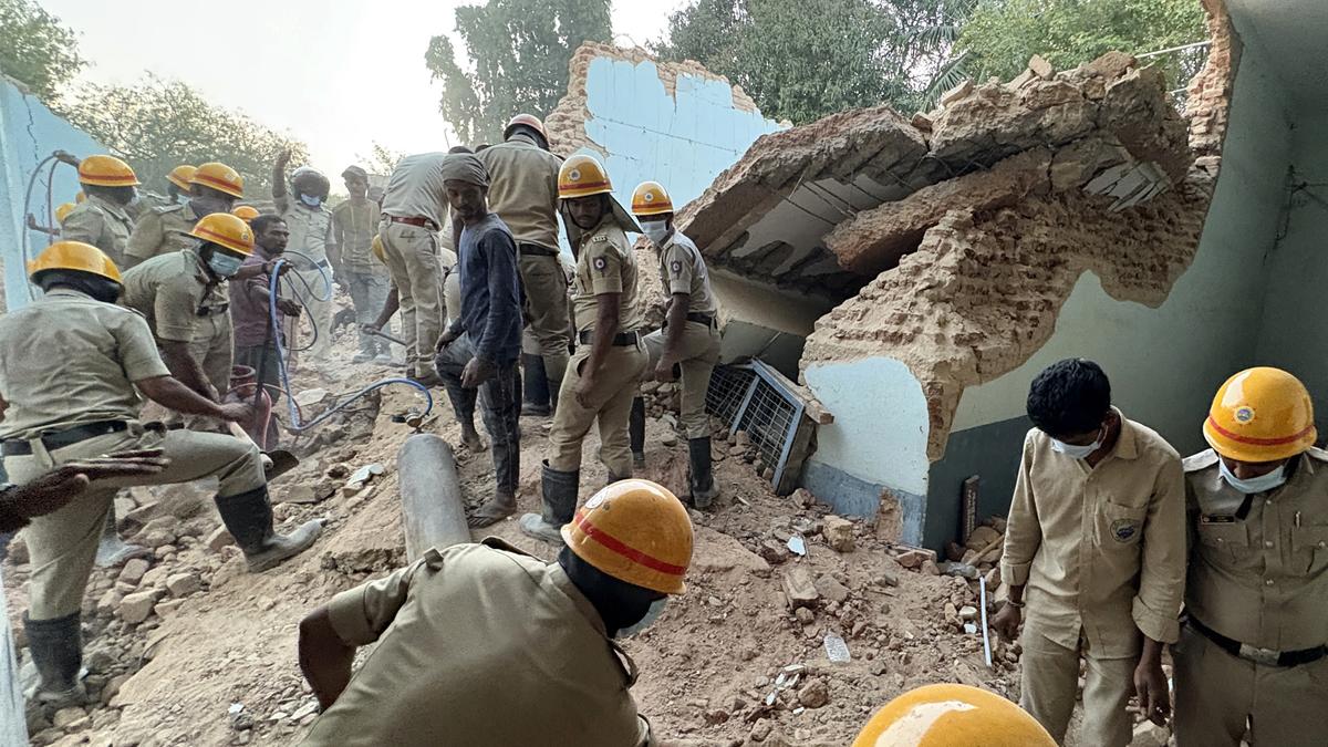 Rescue workers at Maharani’s science college in Mysuru. A portion of the college building collapsed on January 28, 2025. |…