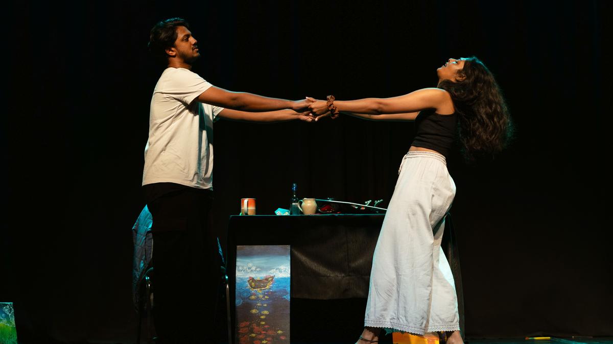 From the play The Meaning of Malar. | Photo Credit: Special Arrangement A small, cozy space with minimal lighting, floor-level…