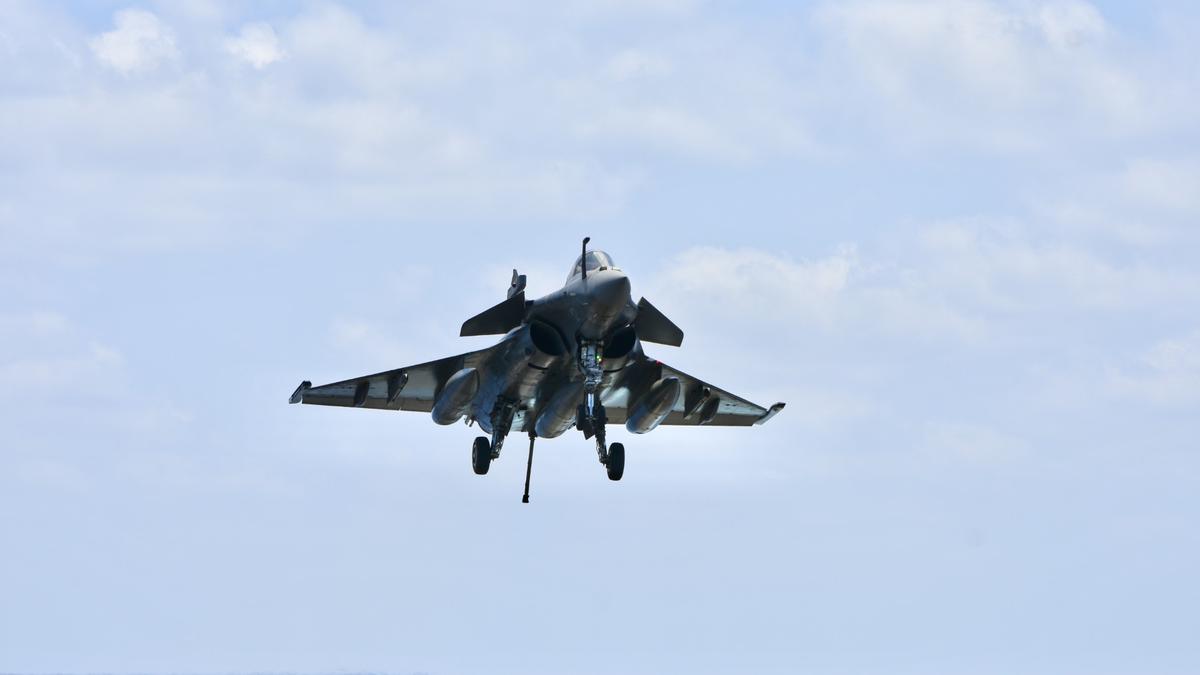A French Navy Rafale-M fighter jet prepares to land on aircraft carrier Charles de Gaulle with an arrestor hook during…