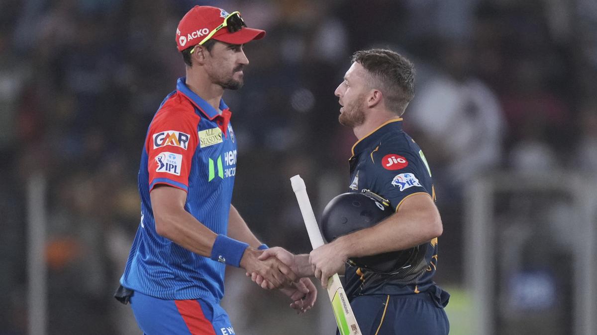 Delhi Capitals’ Mitchell Starc congratulates Gujarat Titans’ Jos Buttler after Gujarat Titans won against Delhi Capitals during the Indian Premier…