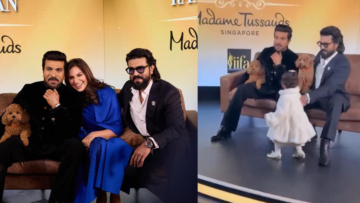 Rhyme, Upasana and Ram Charan with Ram’s wax statue; Klin Kaara runs towards the statue | Photo Credit: @upasanakaminenikonidela/Instagram RRR…