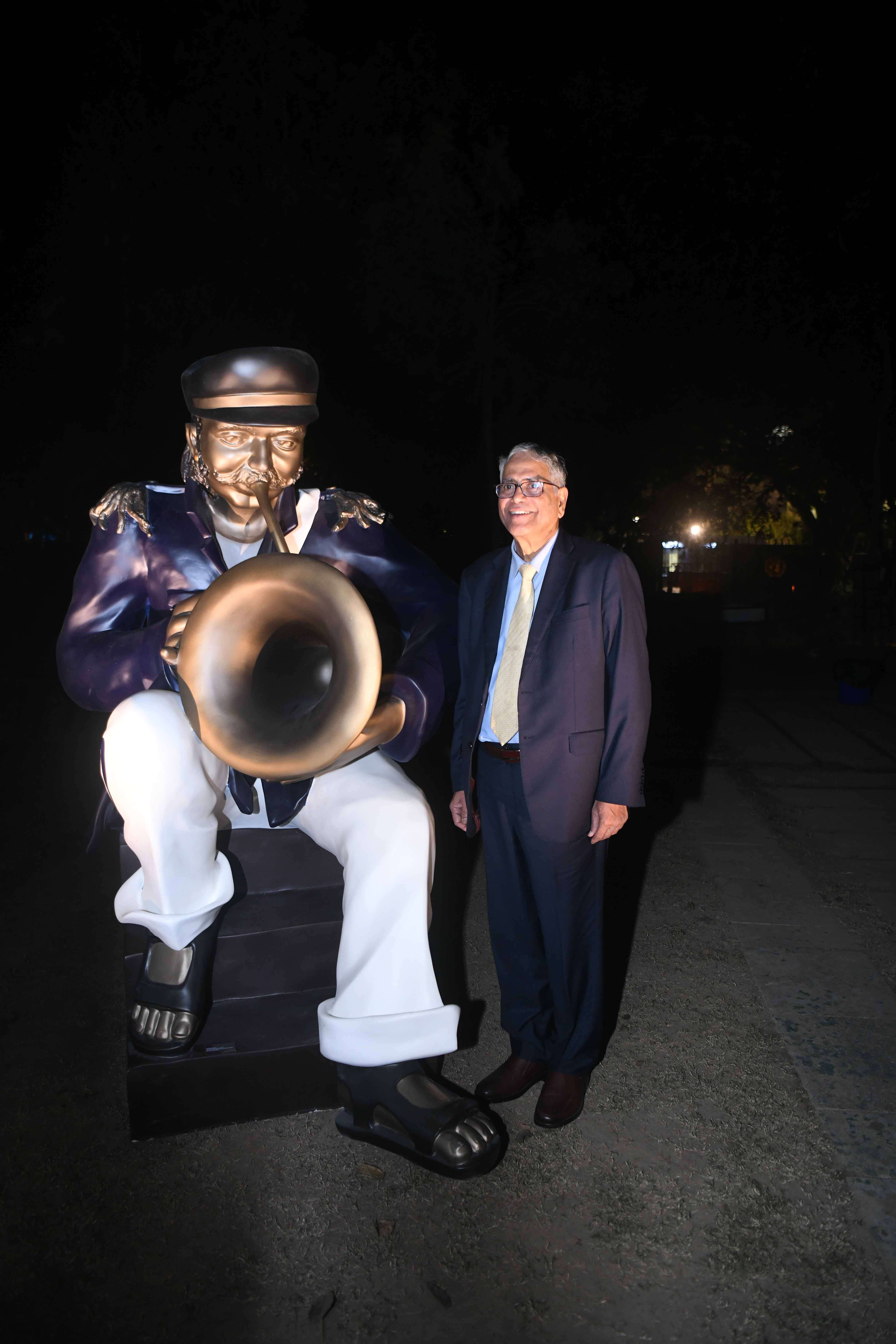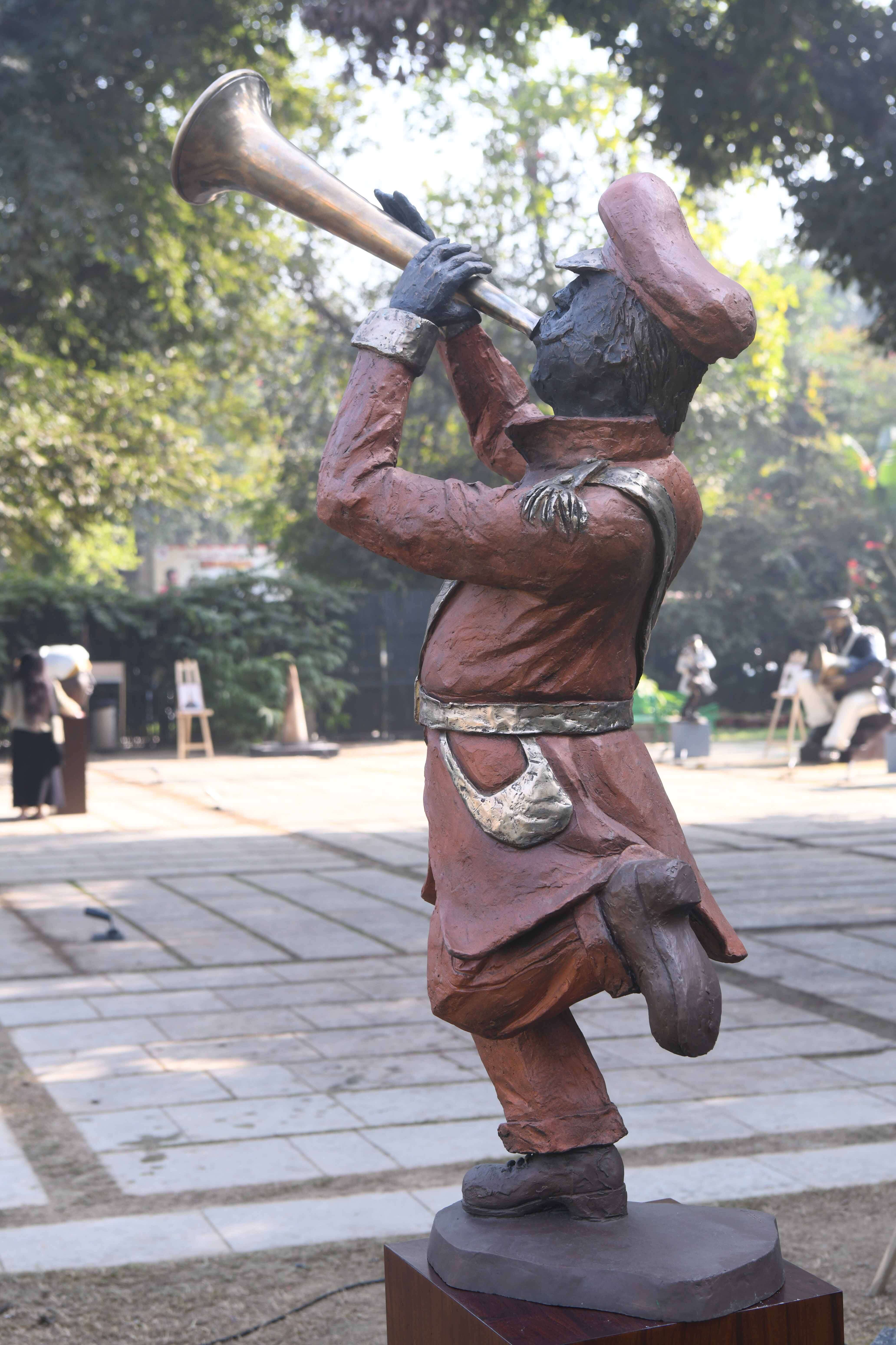 One monumental fiberglass seated Bandwallah  and three smaller standing bronze musicians are compositions that Krishen Khanna began in the  early 1970s and translated into sculptures, they are both emotive as well as expressive in every way. Krishen Khanna’s work engaged with urban life as he experienced it in the rapidly expanding metropolis of Delhi, particularly through subaltern figures like the bandwallas, or members of local brass bands, and manual labourers he regularly encountered. In a career that spans seven decades, his  work places him at the apex of engagement with everyday Indian life. The quartet at IIC shows how he mediates  engagement, the paradoxes of  play that he brings into human view become the very parameters  of how we can read the depth of his series that spoke of social realism and reach.