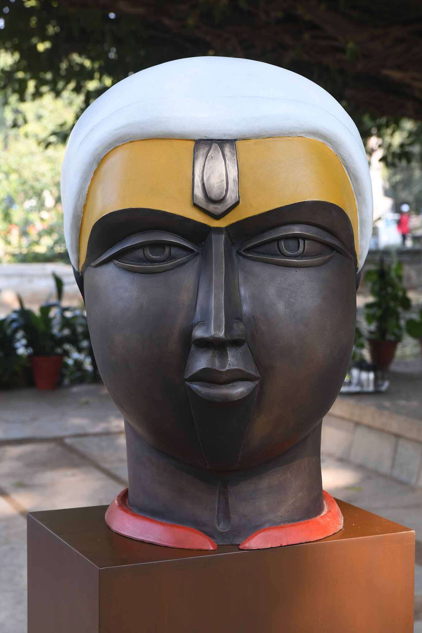 Thota Vaikuntam’s quartet of heads begin with a large fibre glass head and a trio of bronzes that catch the human gaze.The large head is that of the goddess of fertility.