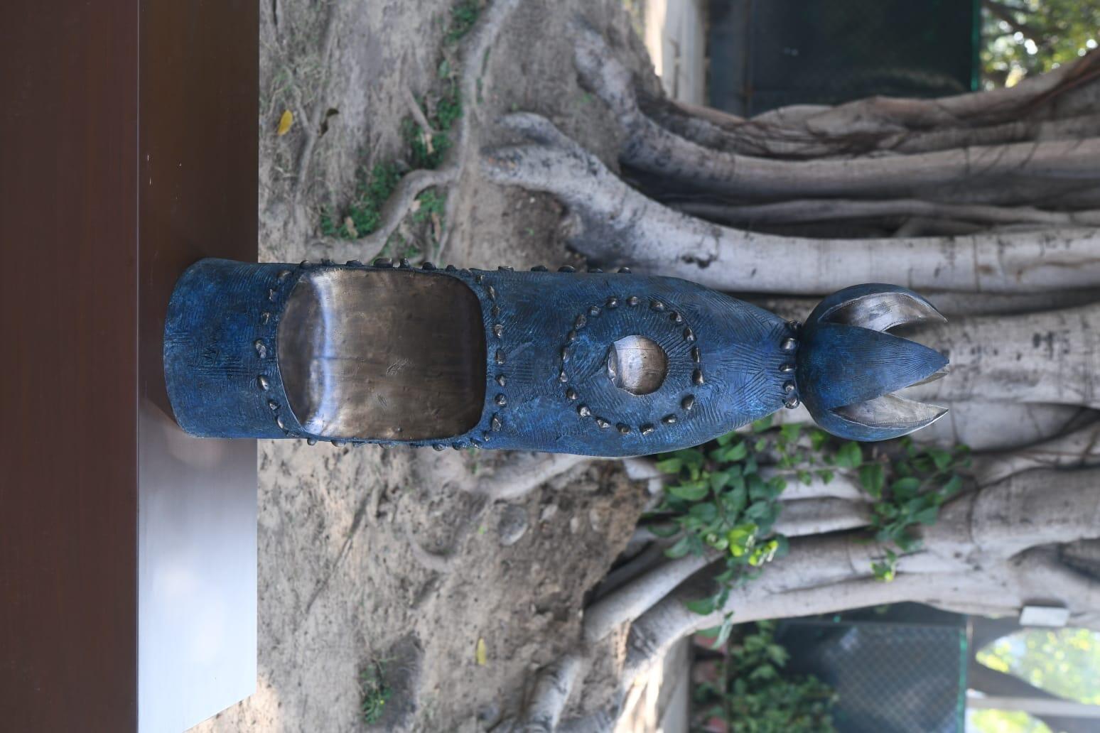 Himmat Shah’s trio also has a multiple sided stone wonder of two birds  in a smaller size and an unusual bronze study of a lotus that has both convexity and concavity with a rare blue textured patina.The beauty of form is what Himmat always explored. This tall singular work has about it an intensity that blends into the salient tree that it stands in front of. Himmat said to me in 2019 that when he looked at his older bronzes, he remembered the struggles and his hunger for creating sculptures even though he was not trained as a sculptor.