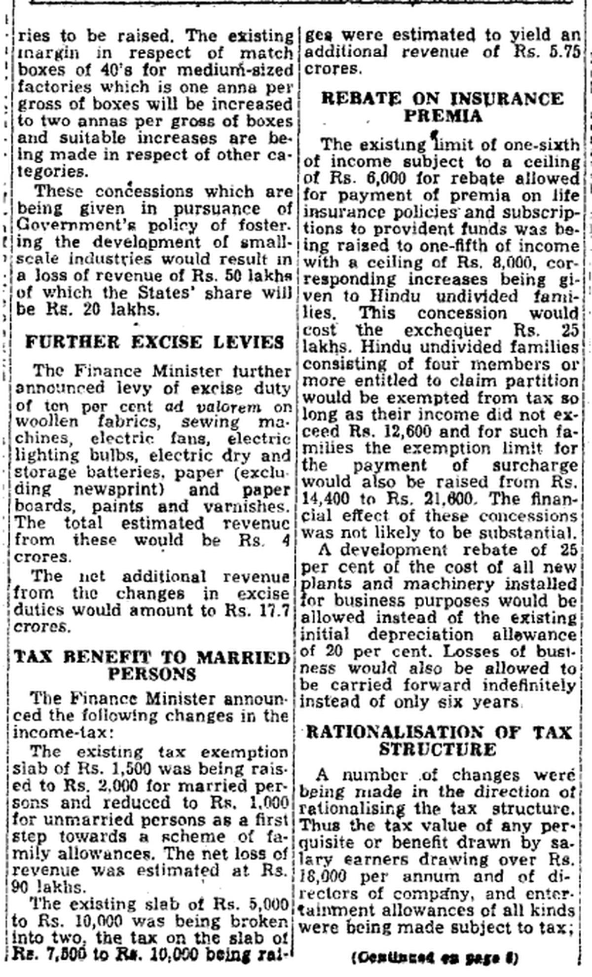 Income tax structure was readjusted. With a focus on families, married persons earning upto ₹2000 were exempt from taxes, while unmarried persons earning above ₹1000 were taxed.
