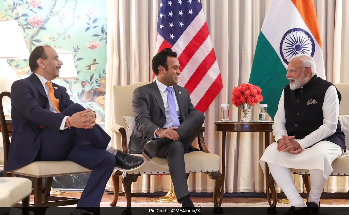 “PM@narendramodimet with@VivekGRamaswamyat Blaire House today.They had insightful discussions on India-U.S. ties, innovation, biotechnology, and the role of entrepreneurship in shaping the future,” Ministry of External Affairs spokesperson Randhir Jaiswal said in a post on X.